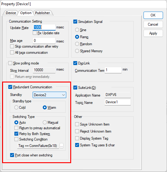 - Set "Redundant Communication" in the device option of the primary device setting.