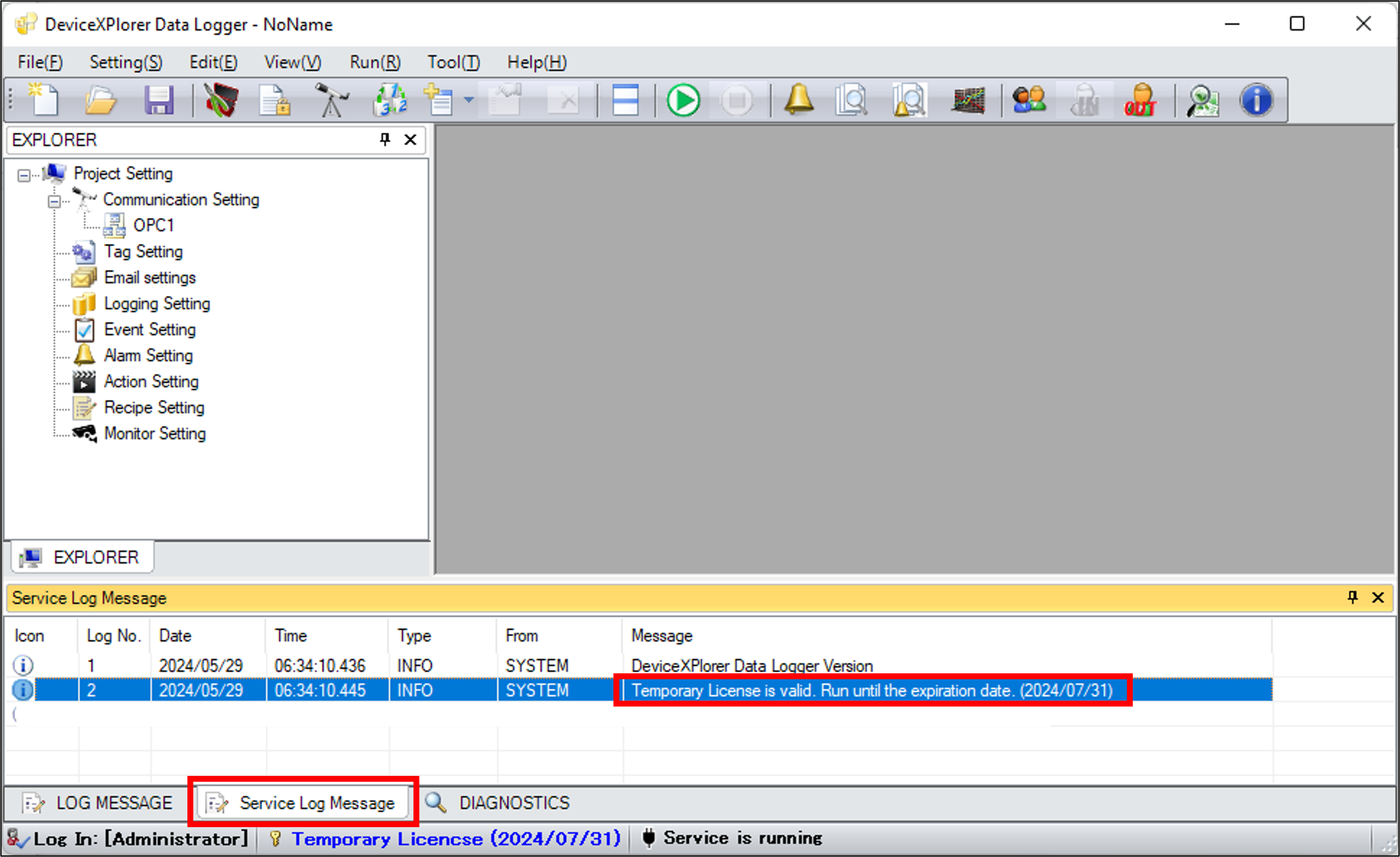 - The temporary license will be recognized by restarting the runtime service "DeviceXPlorer Data Logger V3" in Windows Services Manager and the setting tool application.