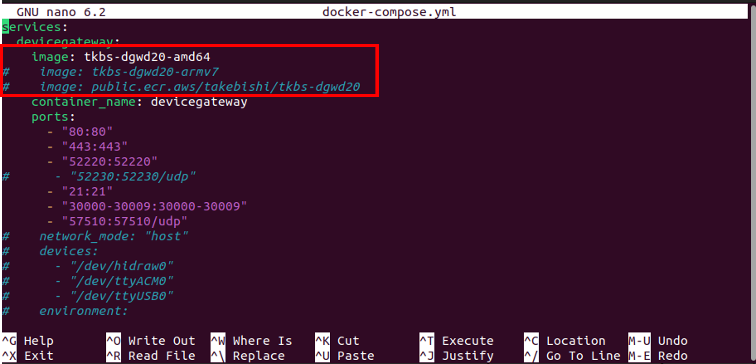 The Docker image of DeviceGateway is uploaded to Amazon ECR Public Gallery (takebishi/tkbs-dgwd20). Your environment can download from the repository and launch DeviceGateway with a Docker Compose file.