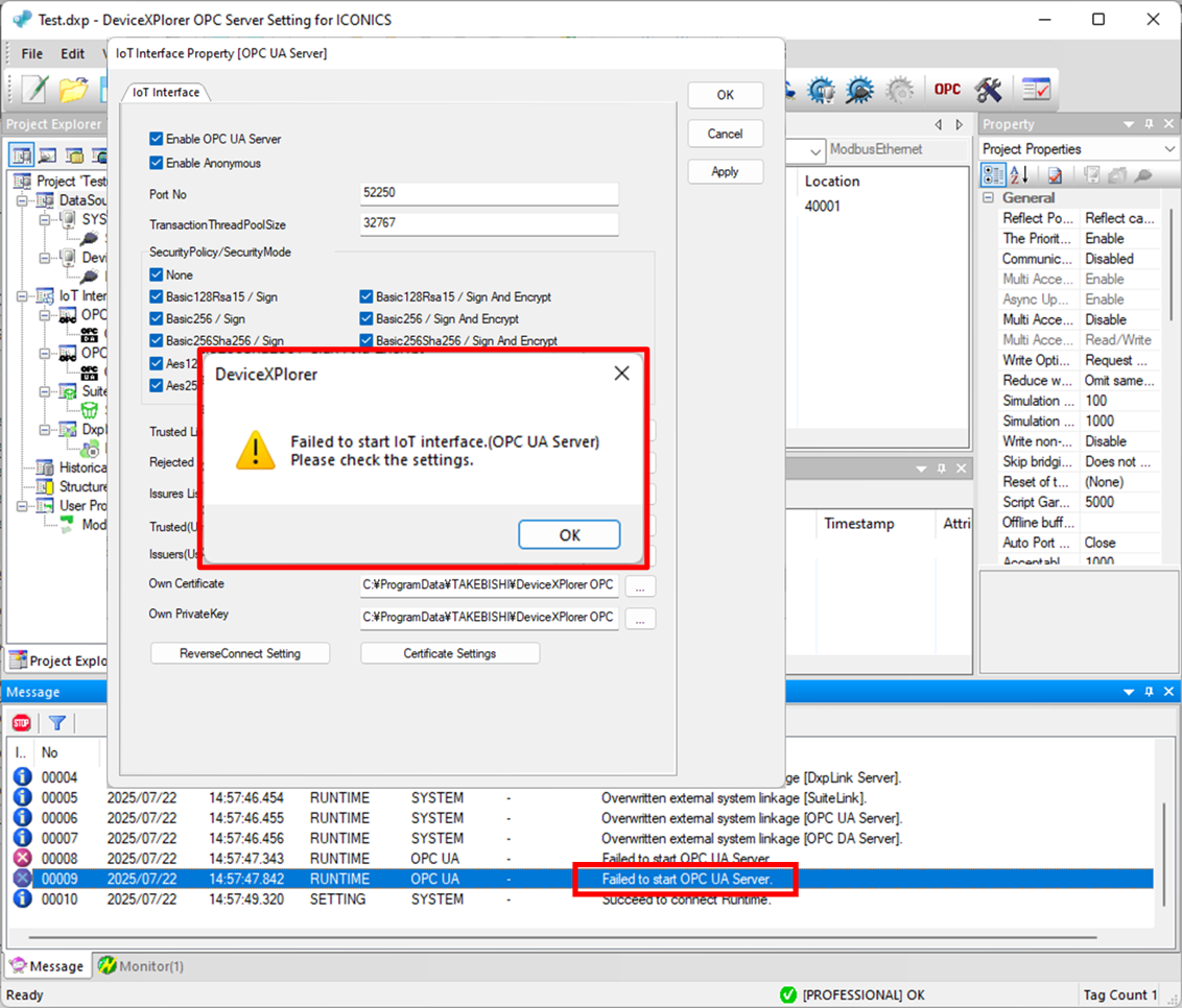 When you try to start the OPC UA server function in DeviceXPlorer, you may encounter the error message "Failed to start OPC UA Server".