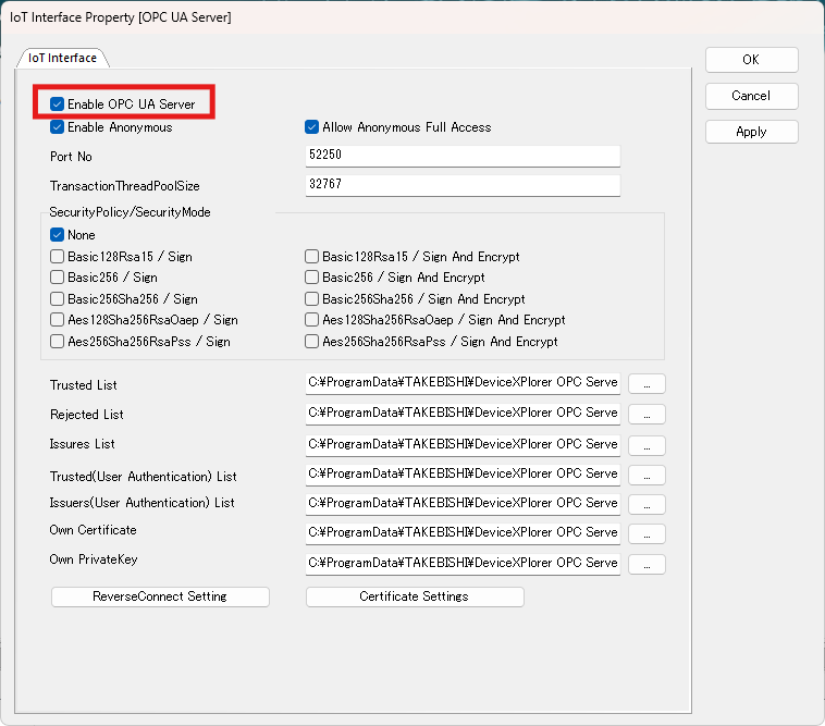 • Check “Use OPC UA Server” and apply the settings to enable the OPC UA server function.