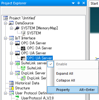 From Project Explorer, go to “External System Integration”, right-click on “OPC UA Server”, and select “Properties” to configure the OPC UA server settings.