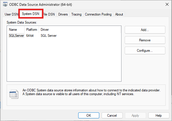 The data source is configured as a User DSN, which cannot be referenced by the service processes.