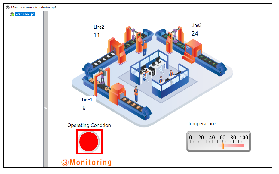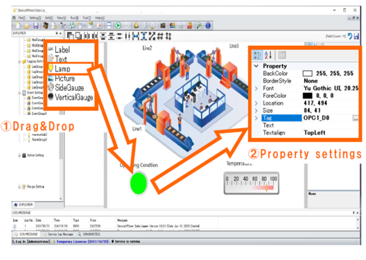 Items such as labels, lamps, and gauges can be placed on the Maker screen, and equipment data can be monitored in real time on the Viewer screen.