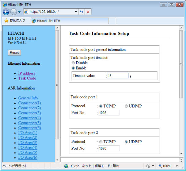 - Specify the protocol and port number(decimal) for task code communication. It is accessable to connect EH-150 until max 4 ports.
