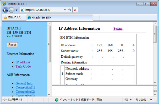 Ethernet parameters are made using WEB browser. Open set up pages from WEB browser by specifying IP address of the Ethernet unit.