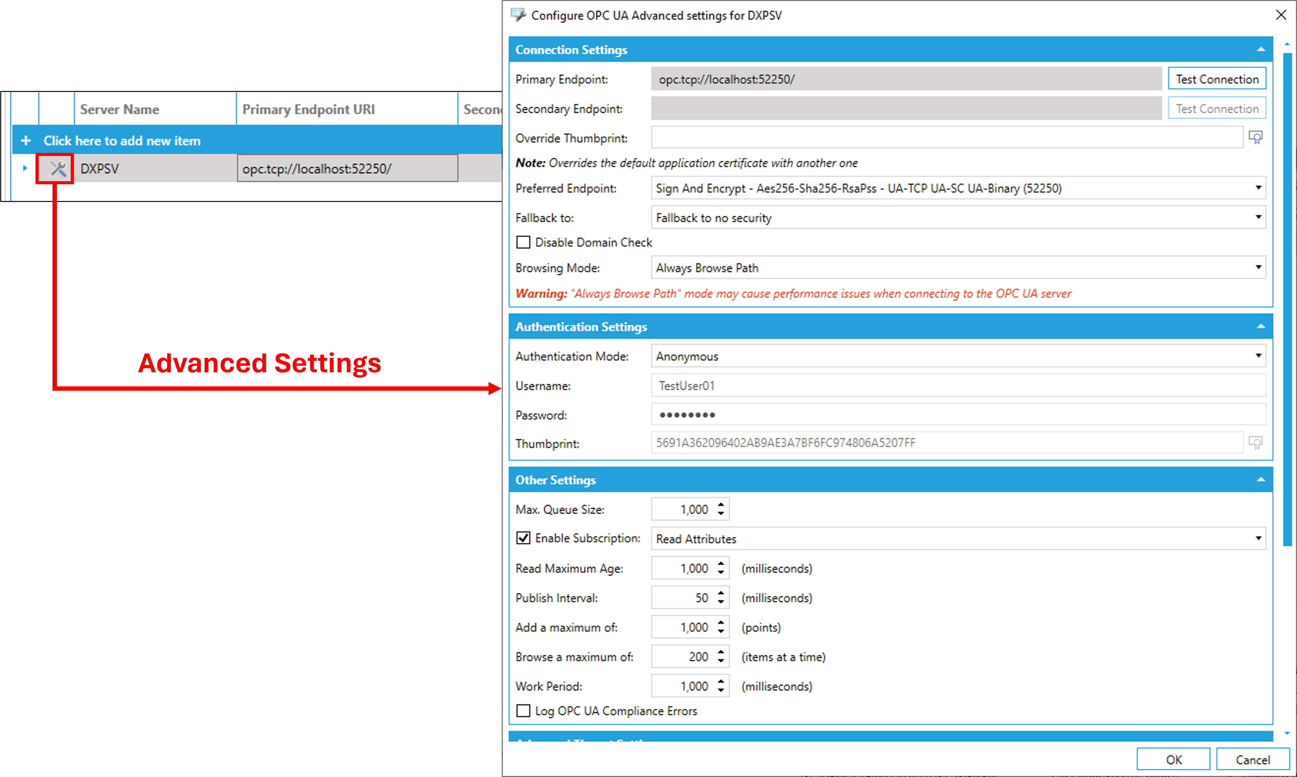 Configure the necessary items such as UA certificate and security policy, then select [OK].