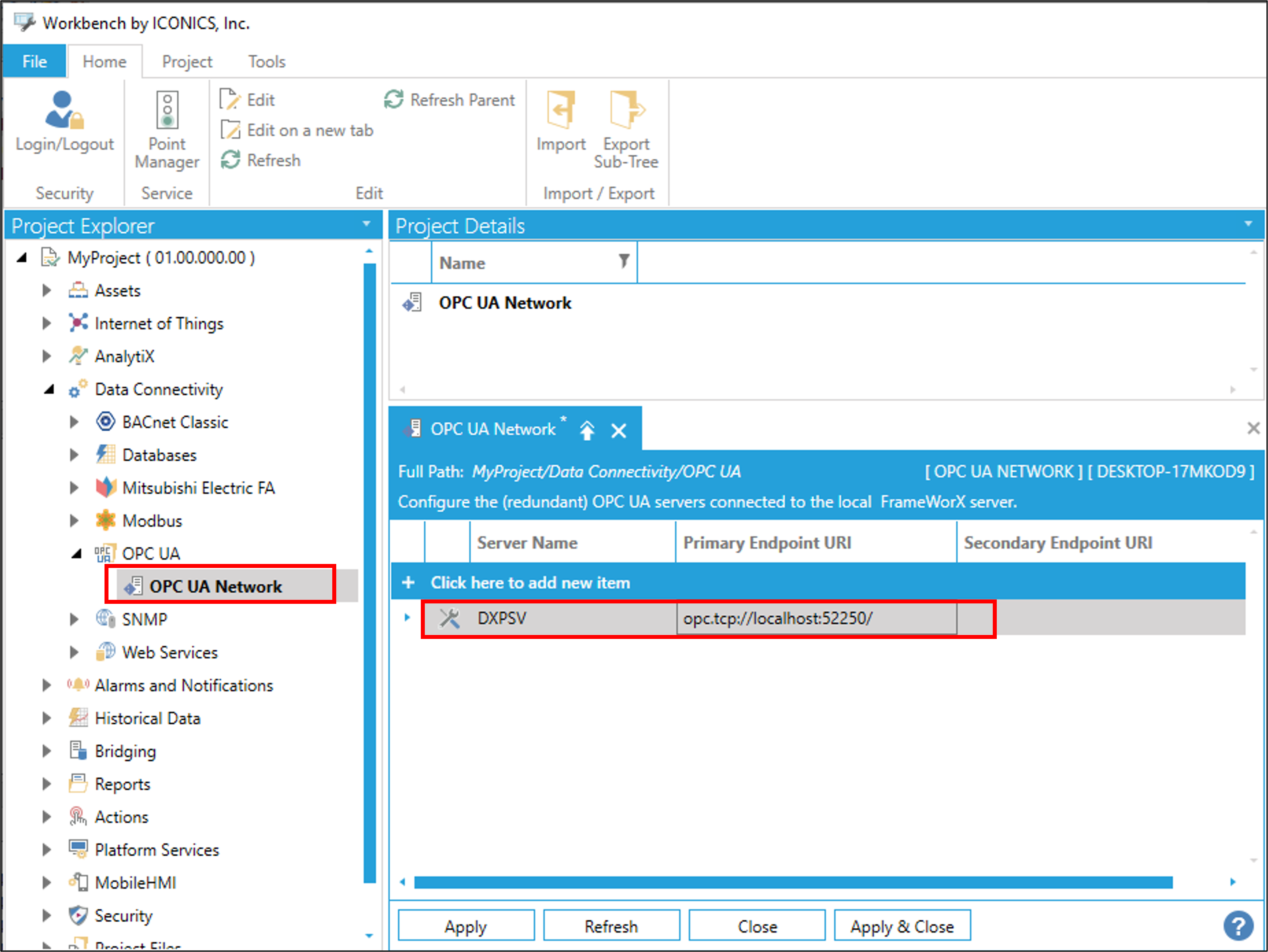 In Workbench, select in the Project tab; [Project Explorer] > [MyProject] > [Data Connectivity] > [OPC UA] > [OPC UA Network].