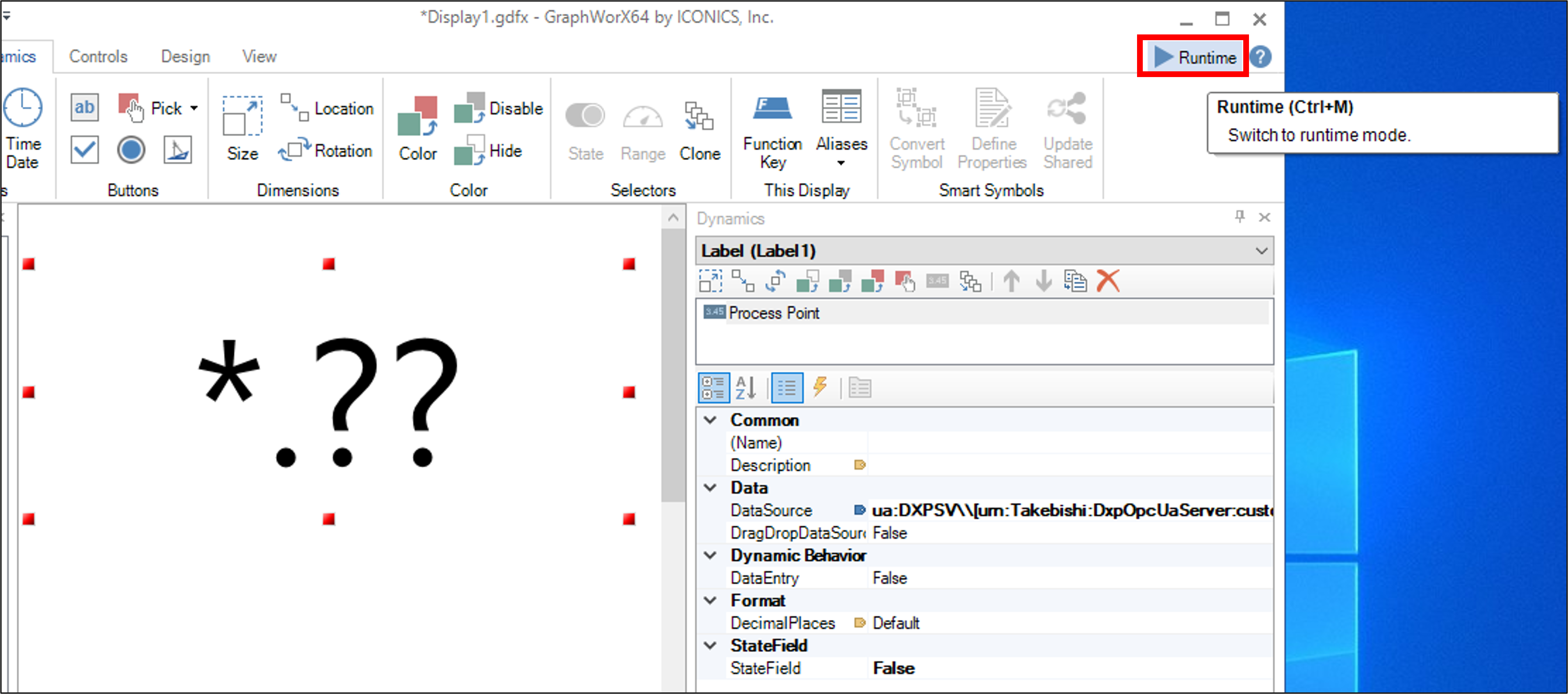 When execute the Runtime, the GraphWorX start communcating with the datasource of the OPC Server.