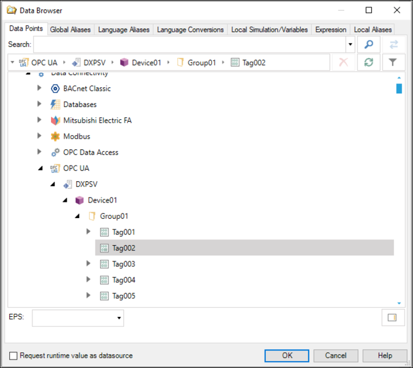 The following shows the setting method when our OPC Server (UA Server) is used with ICONICS SCADA "GENESIS64". For details on how to set up the SCADA, please contact ICONICS.