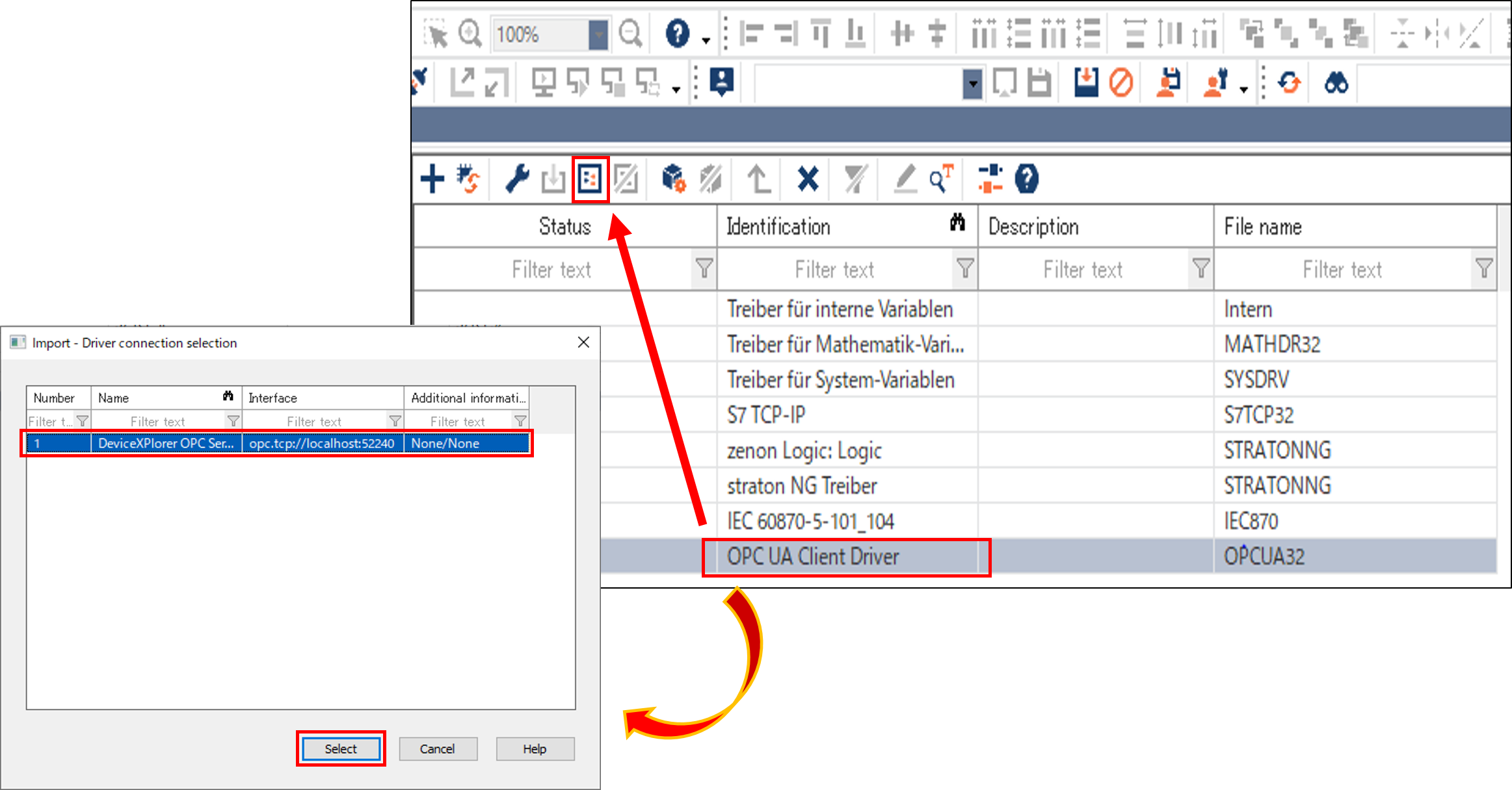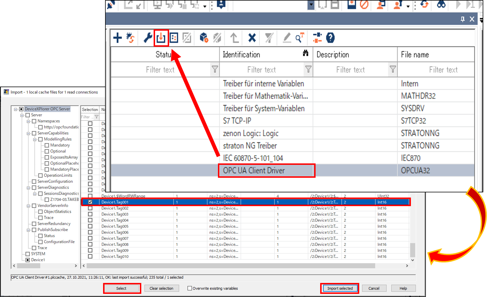 Select the created UA Client Driver from Project Manager->"Variables"->"Drivers". Then import the variables from the driver. Select the target tag when the dialog window is displayed and click "Select" -> "Import Selected" to register the tag.