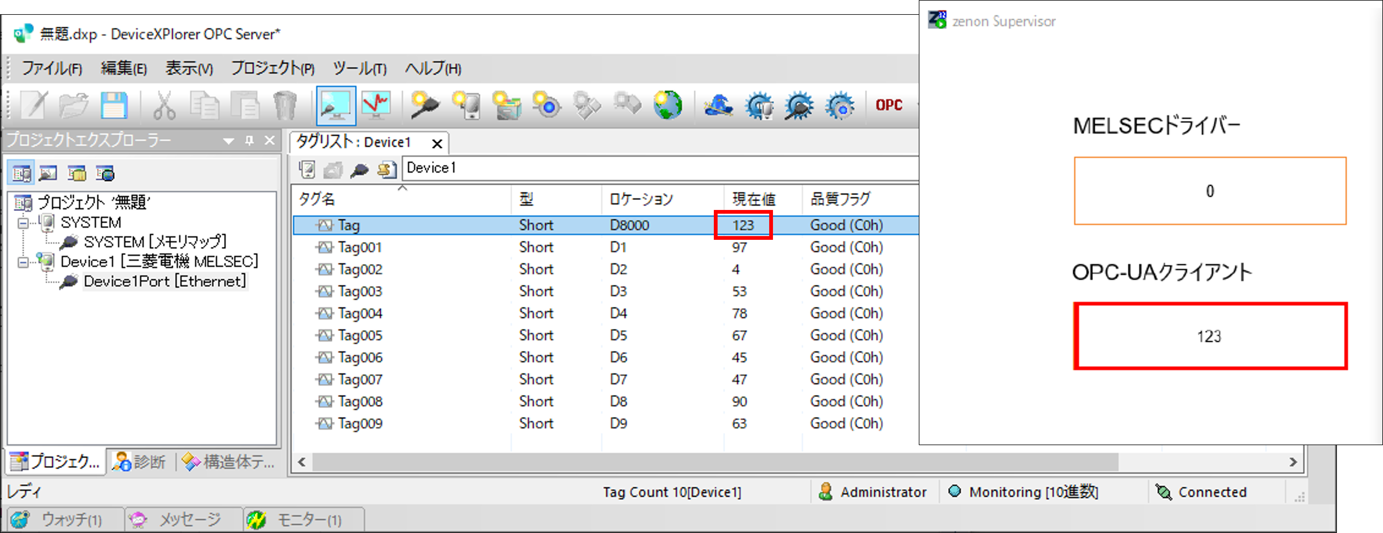 The same value with the variable of the OPC server is displayed on the item placed on the monitoring screen.
