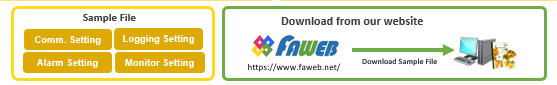 It is possible to obtain a sample file of the AMS connection on FAWEB. The sample file includes base configuration for communication/loggging/alarm/monitoring settings. By using the sample file, data transfer is possible with minimal required changes.