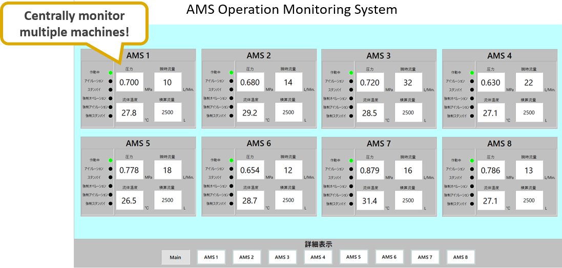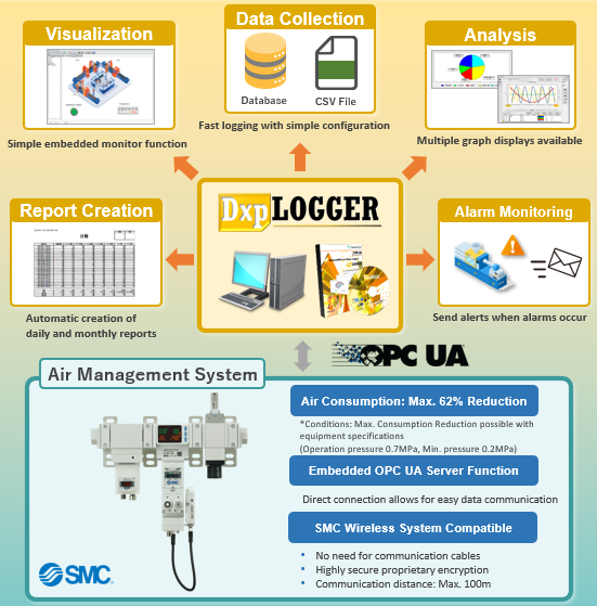 Air Management Systems monitor the production standby state (when production is stopped) and automatically reduces air pressure to limit unnecessary air consumption. It has communication functions such as OPC UA and Ethernet/IP, and also supports wireless communication.