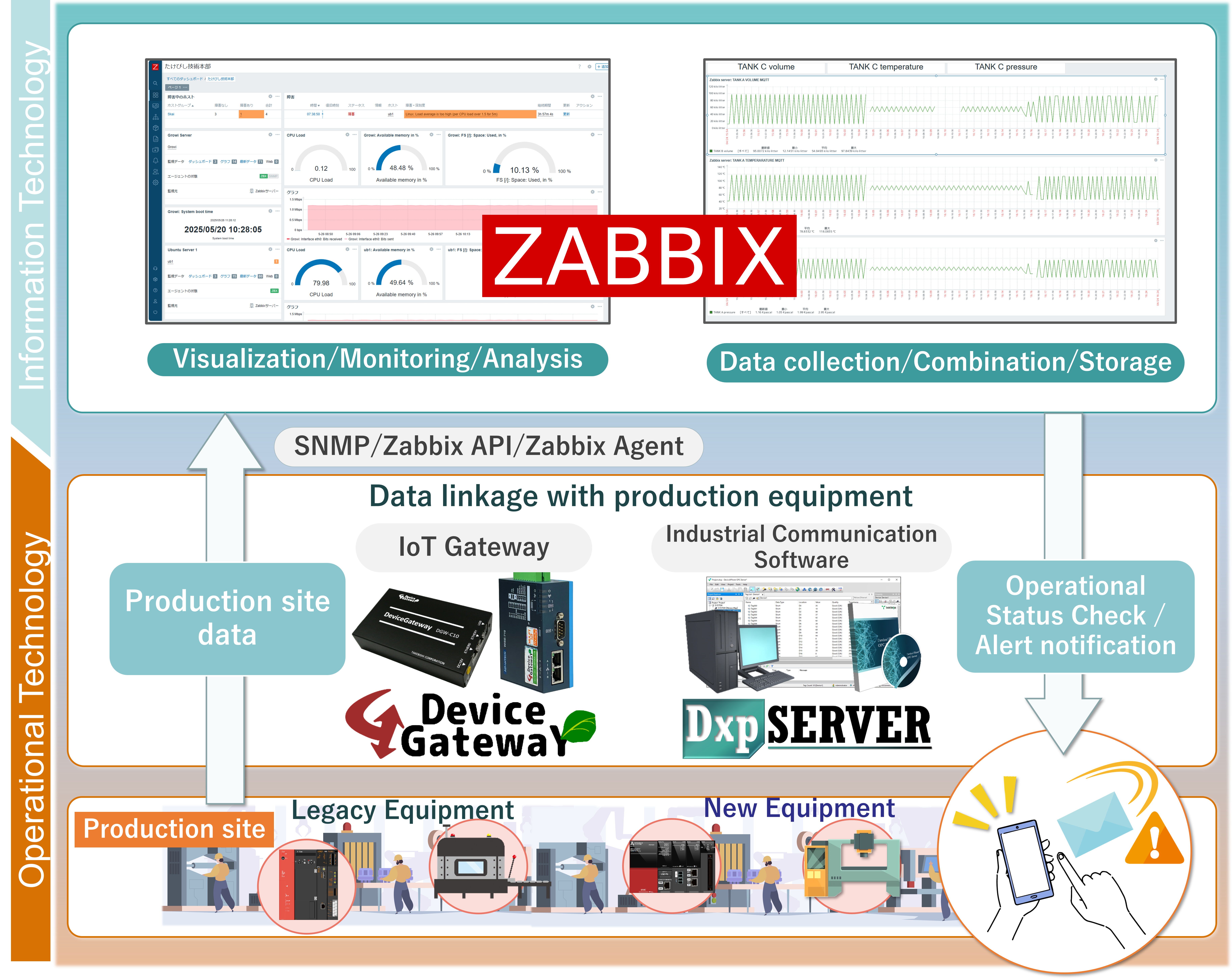 In the manufacturing industry, data utilization and remote monitoring are made difficult by the seperation of on-site control devices (OT) and IT systems.By connecting with Takebishi DeviceXPlorer OPC Server and DeviceGateway, data from PLCs, FA devices, and sensors operating at manufacturing sites can be visualized and stored in Zabbix. This facilitates long-term understanding of operational status, alarm configuration, and other high-level centralized monitoring of IT/OT systems.