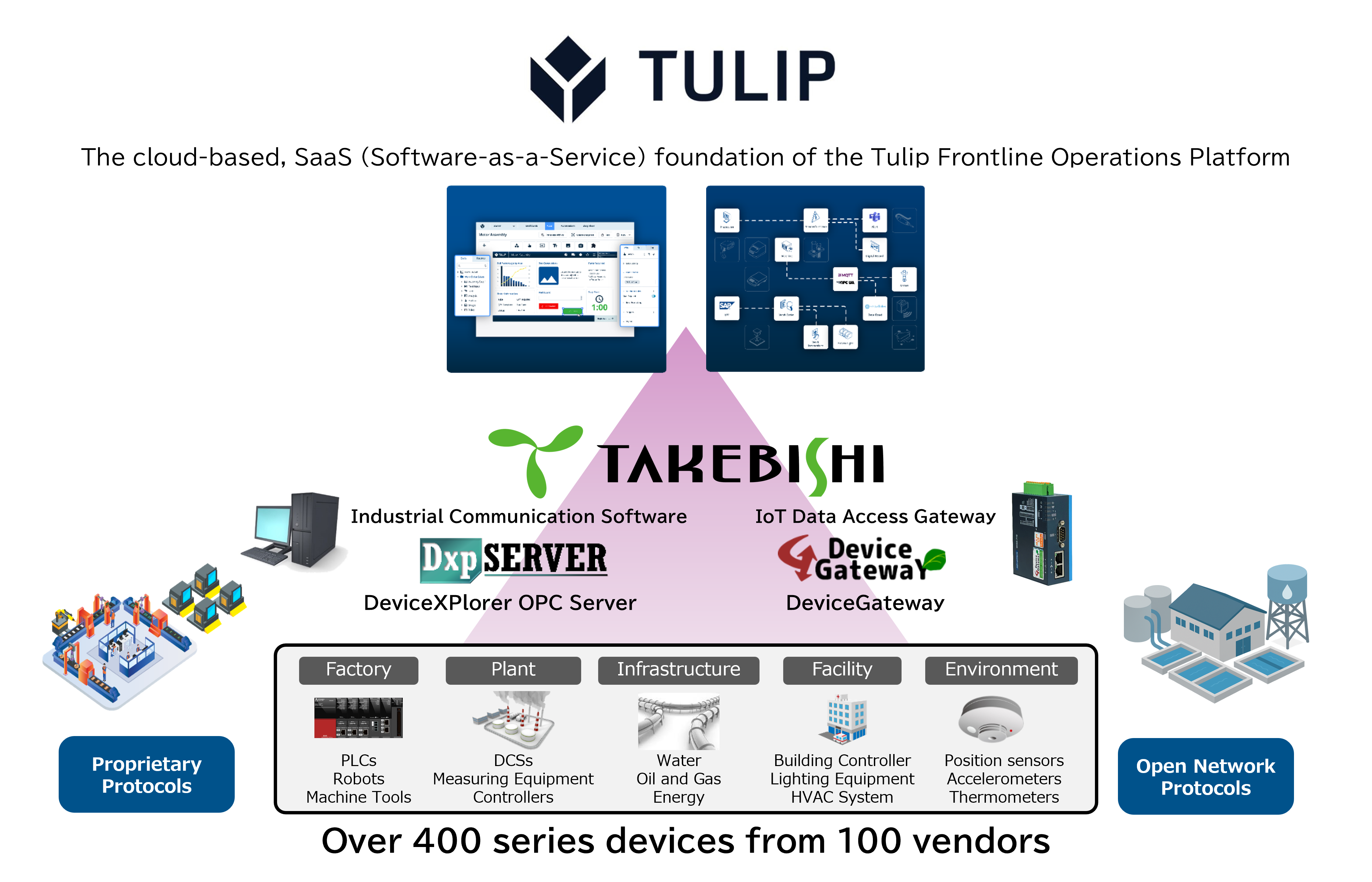 Takebishi OPC solutions integrate easily with Tulip and serve as a robust, industrial‑grade bridge from heterogeneous device protocols to standardized OPC UA, which Tulip can securely consume through OPCH.