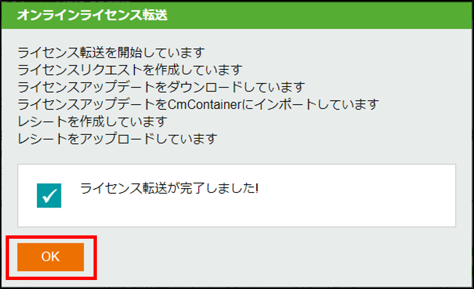 3.5 「ライセンス転送が完了しました!」と表示されたことを確認し、[OK]をクリックします。