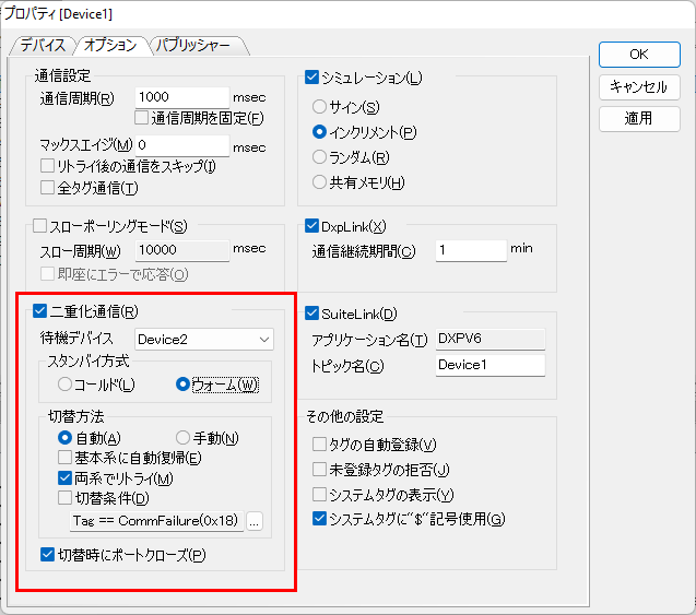- 主系のデバイス設定のデバイスオプションで「二重化通信」を設定します。