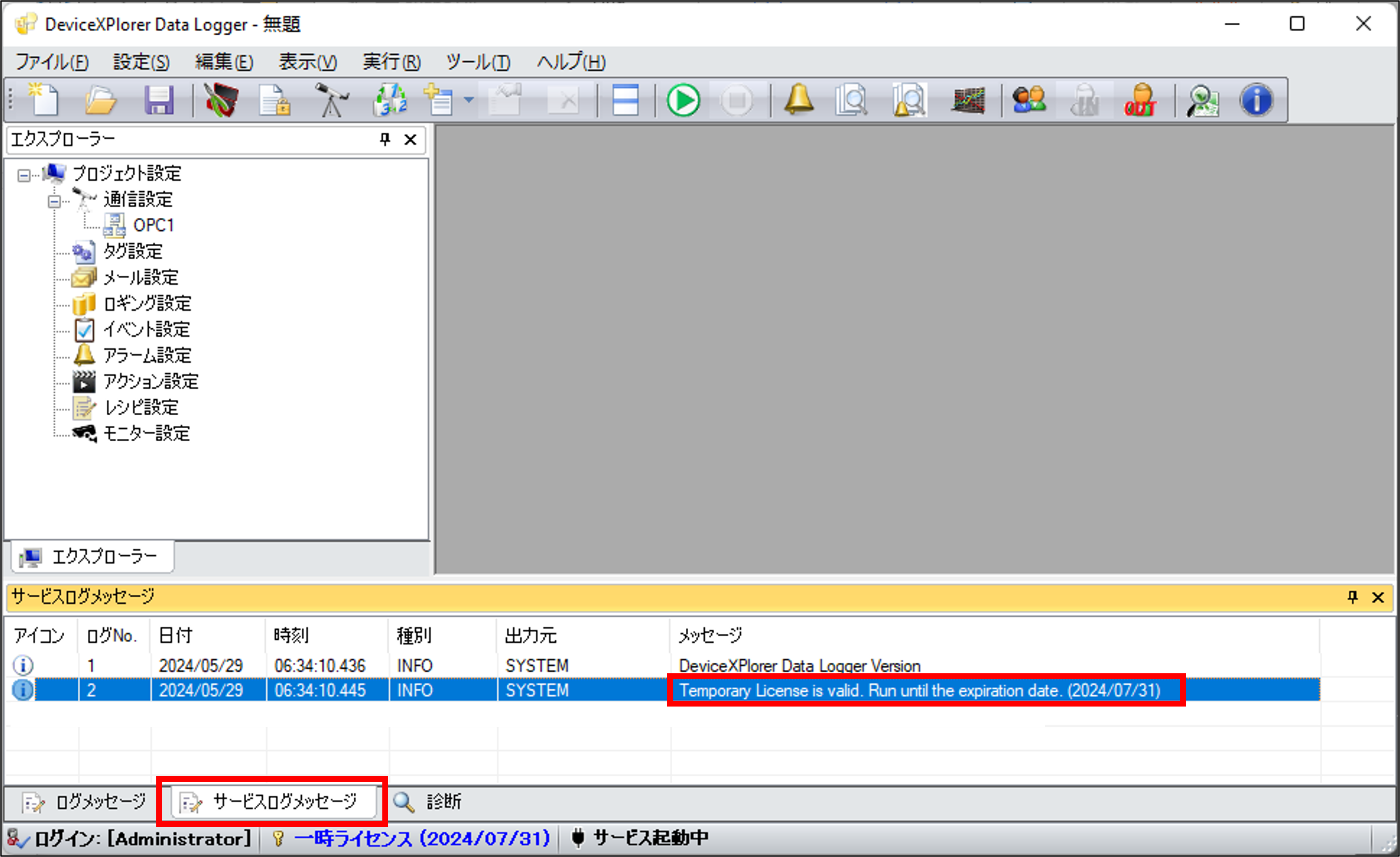- Windowsサービス一覧からDXPロガーのランタイムサービス(DeviceXPlorer Data Logger V3)を開始し、設定ツールを起動すると、テンポラリライセンスが認識されます。