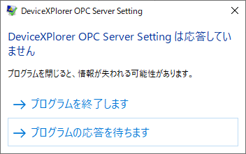 デバイスエクスプローラ OPCサーバー バージョン7の設定ツールで変更を行った後に、設定完了に時間がかかる場合や、下図のような「応答なし」ダイアログが表示される場合は、ランタイムへの設定内容の反映に時間がかかっていることが考えられます。