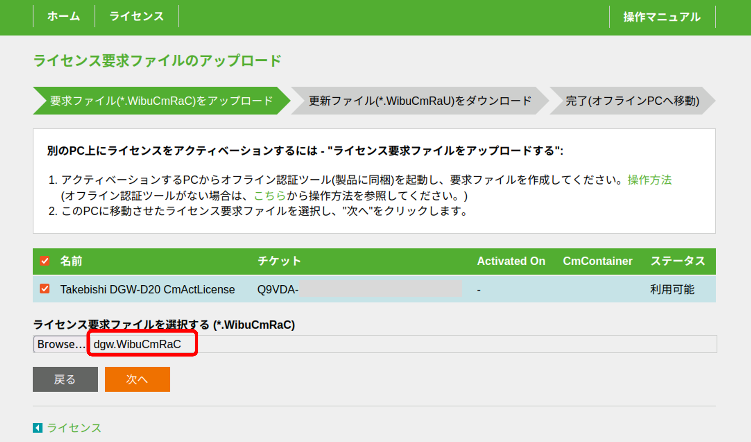 - 出力されたライセンス要求ファイル "dgw.WibuCmRaC"を取得します。
