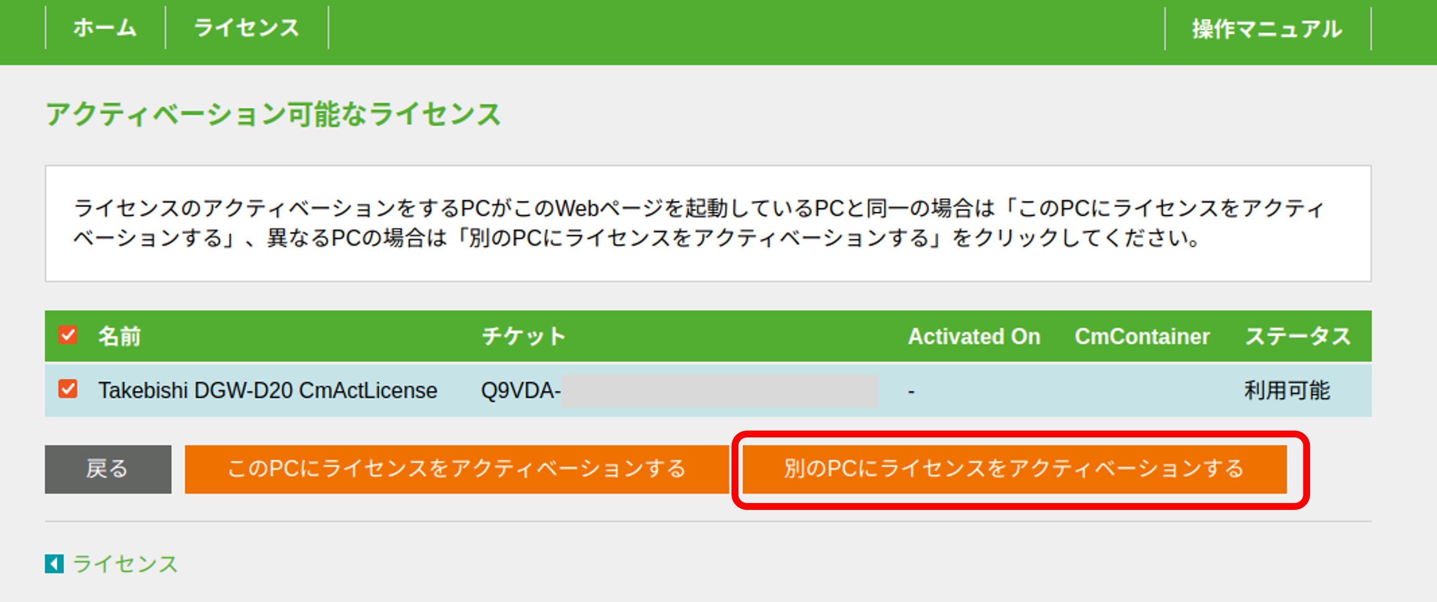 - ライセンスのアクティベーション"ボタンをクリックし、"別のPCにライセンスをアクティベーションする"ボタンをクリックします。