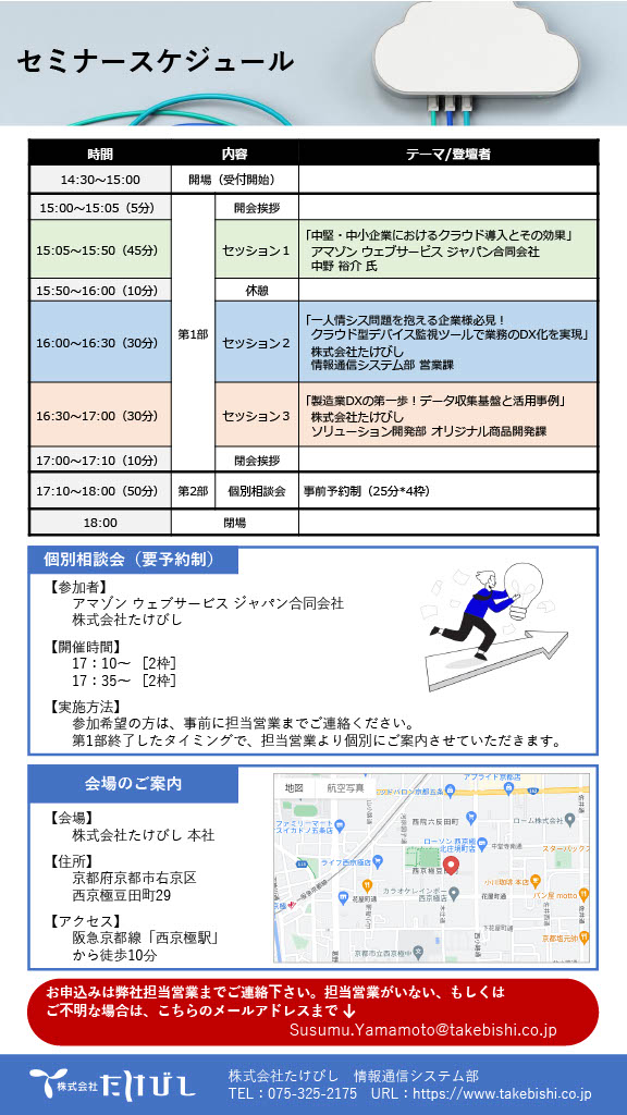 このたび、12月22日(金)に弊社京都本社にて「はじめようAWSセミナー」と題し、弊社製品とAWSの活用方法や活用事例について理解を深めていただくためのセミナーを開催いたします。