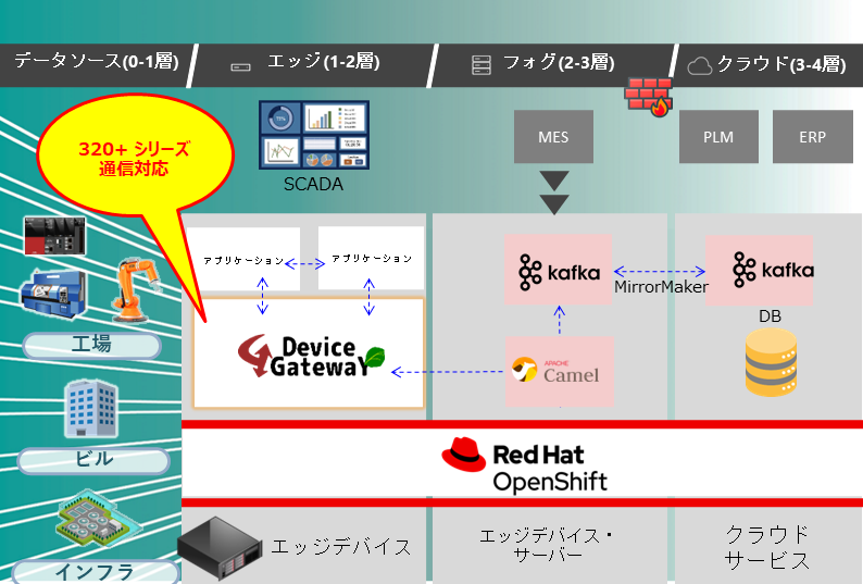 弊社のIoT対応データアクセスソフトウェア『デバイスゲートウェイ』がRed HatのOpenShift認証を取得しました。『デバイスゲートウェイ』は320シリーズ以上の制御機器の通信に対応しているソフトウェアです。OpenShiftプラットフォームを活用することで各現場の端末に『デバイスゲートウェイ』を導入し、集中監視することができます。これにより製造業における大規模な設備データ活用に貢献します。