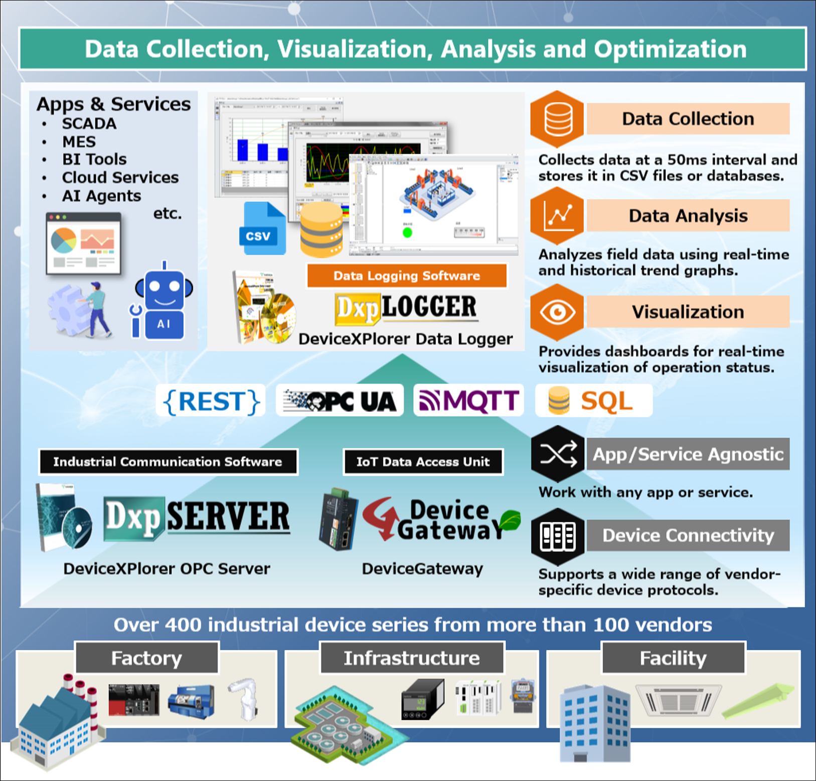 400シリーズ/100ベンダー以上の機器との通信に対応し、国際標準規格OPCや汎用のIoTインターフェイスであるMQTT/REST等を通じて様々なアプリケーションやサービスとの連携を可能にします。