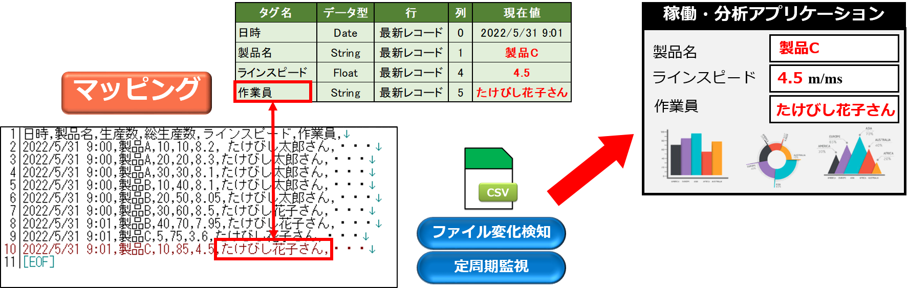 デバイスエクスプローラ ファイルリンカーはCSVなどのテキストファイルのデータを、IoTサービスに橋渡しするソフトウェアです。 設備に眠っているファイル資産を活用し、IoT化を実現します。