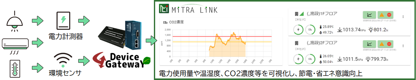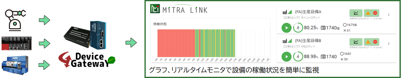 たけびしオリジナルのIoT対応データアクセスユニット「デバイスゲートウェイ」と連携することで、IT機器だけでなく、PLCや生産設備、各種センサ等、多彩な機器より情報収集が可能。生産現場等の見える化を手軽に実現できます。