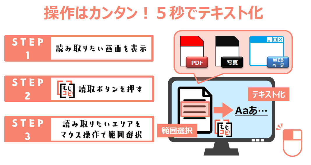 PDFファイルや画像ファイル、WEBページなど画面上の画像からテキストデータを抽出する簡単テキストコピーツールです。