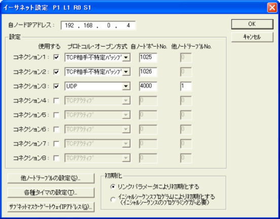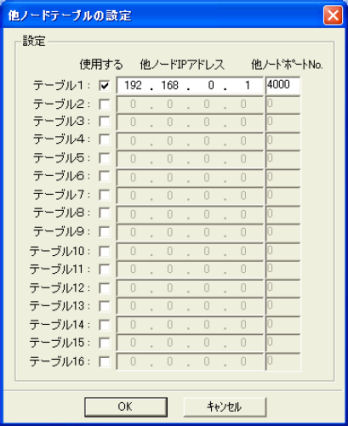 - TCP相手不特定パッシブ以外は、接続先のIPアドレスとポートNo.が設定された他ノードテーブルNoを指定します。