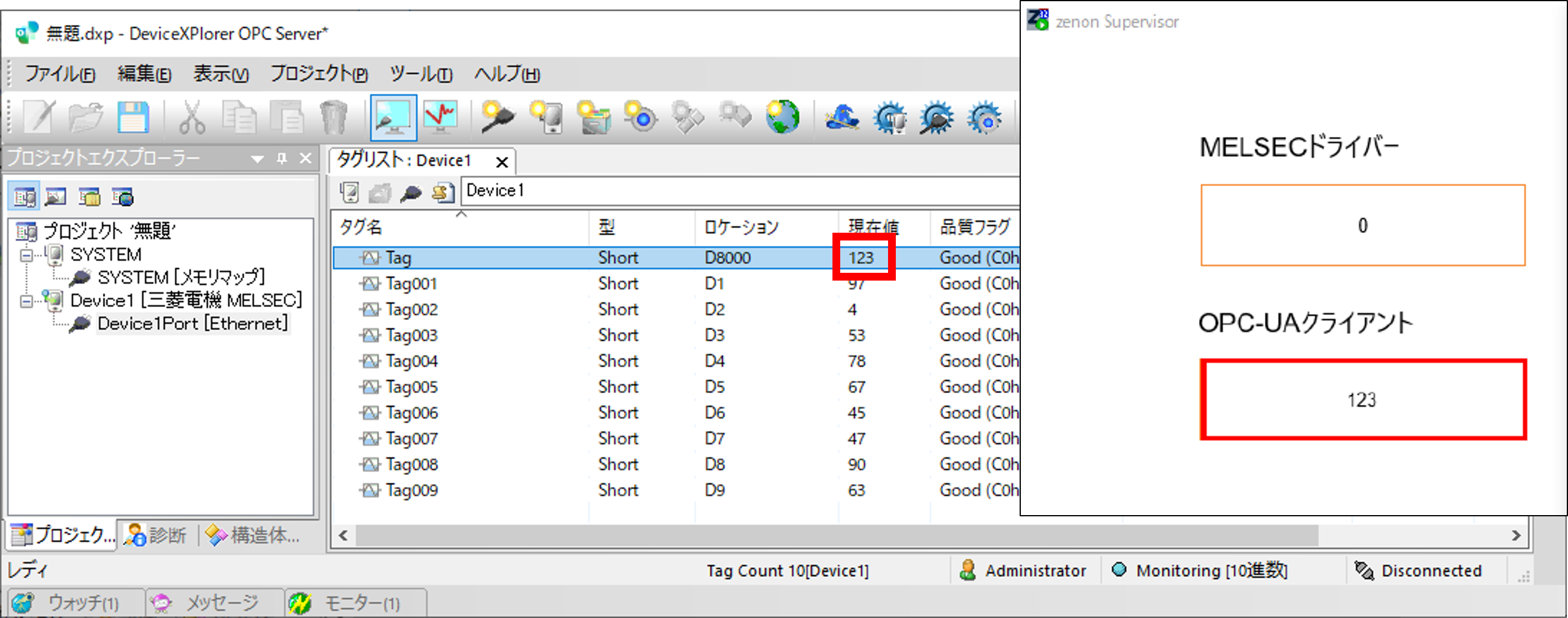 作成した監視画面に配置したアイテムに、OPCサーバーの変数値と同じ値が表示されます。