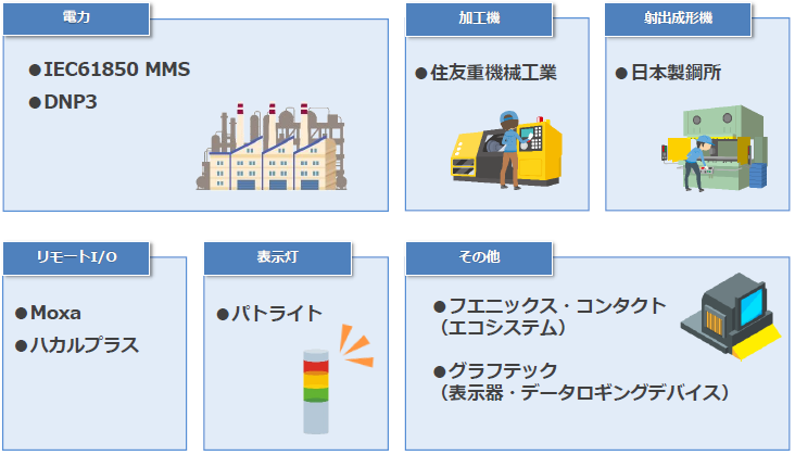 電力装置向けの汎用プロトコル「IEC61850」や「DNP3」などの通信仕様に対応します。その他、各種フィールド機器への接続機種が拡充しております。