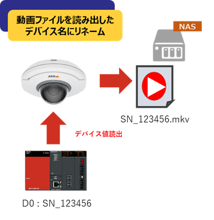出力された録画ファイルのファイル名を指定したPLCのデバイス値にリネームします。これにより録画ファイルと製造番号との紐づけが簡単に行えます。