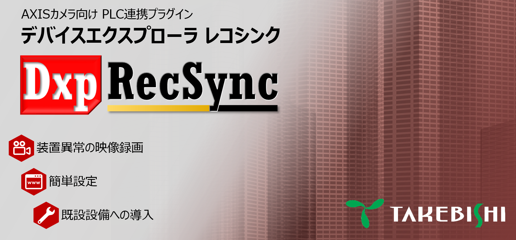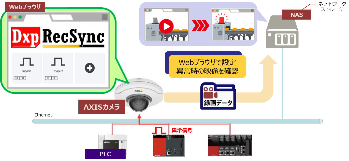 DxpRecSyncは、Axis Communications社製ネットワークカメラと組み合わせて使用することで、 生産現場における設備の異常発生時の映像を記録するソフトウェアです。 本ソフトウェアをインストールしたネットワークカメラを製造ラインに導入することで、 既設PLCプログラムを変更することなく、異常発生前後の映像追跡を実現できます。