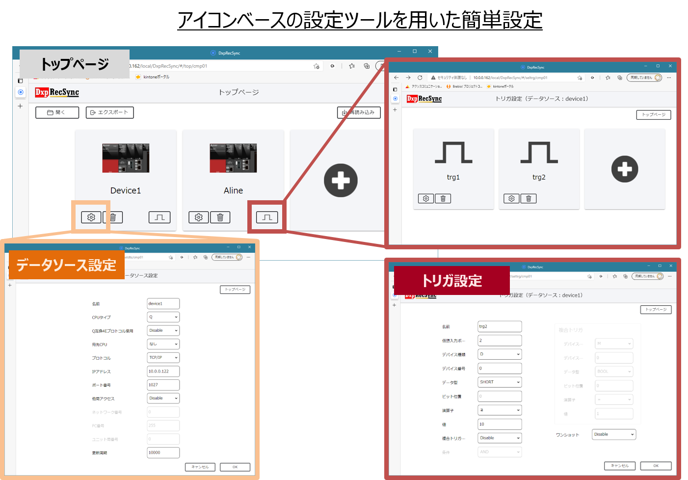 通信先PLCやトリガなどの各種設定はWeb画面で設定します。 Google ChromeやMicrosoft EdgeなどのWebブラウザを使用可能な端末があれば、簡単に設定作業を行えます。