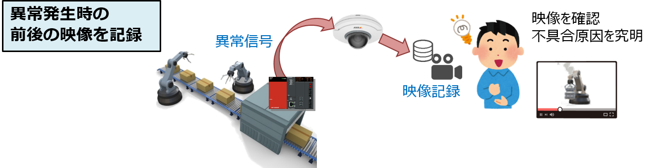 PLCの異常信号を検出した場合、異常前後のカメラ映像を録画し、録画データをNASやSDカードなどのストレージに保存します。