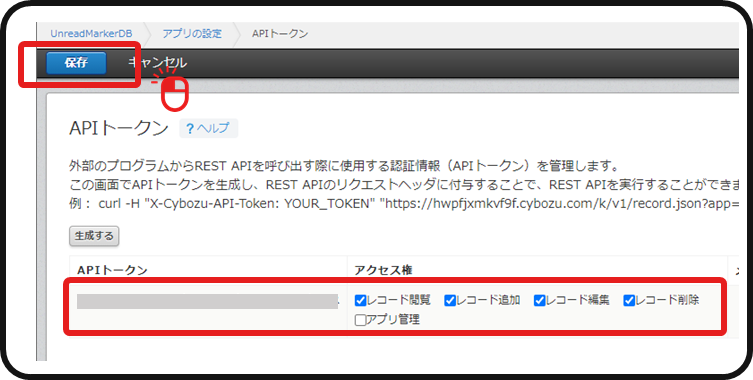 レコード閲覧、レコード追加、レコード編集、レコード削除のアクセス権があるAPIトークンが必要です。