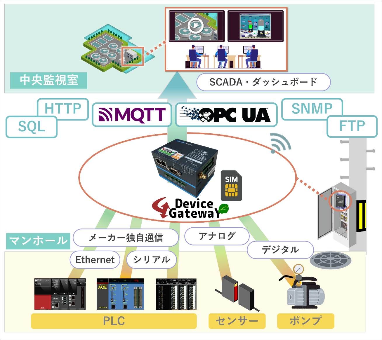 デバイスゲートウェイとLTE回線を使うことで、マンホールポンプを制御するPLCから水位やポンプ稼働情報、エラー情報などをOPC UAやMQTTプロトコルで上位サーバーに送信します。値が変化した時にのみこれらの情報を送信することでLTE通信料を押さえることもできます。上位サーバーでは汎用のSCADAやダッシュボードを用いて監視を行います。デバイスゲートウェイは殆どすべてのメーカー・シリーズのPLCに対応しているため制御設備側の変更は必要なく、既存の制御システムを残したまま、広域かつリアルタイムな設備監視を実現します。また、OPC UAやMQTTの認証・暗号化技術を使って高いセキュリティを実現します。