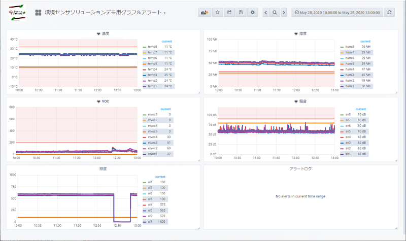 複数個所の環境データを同時に計測し、リアルタイムで状況の監視や異常検出が行えます。
