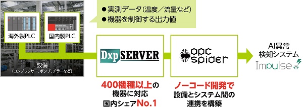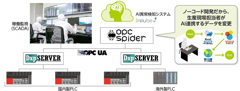 工場内の設備には約80台のPLCが稼働しているが、さまざまなメーカーのものが利用されており、一部は海外メーカーのものも存在する。 これらの異なるベンダーやシリーズのPLCからデータ取得を行い、AI異常検知システムに橋渡しを行うのがたけびしのOPC UA対応通信ソフトウェア「デバイスエクスプローラ OPCサーバー(DxpSERVER)」、ならびにノーコードデータ連携ツール「OPC Spider」である。